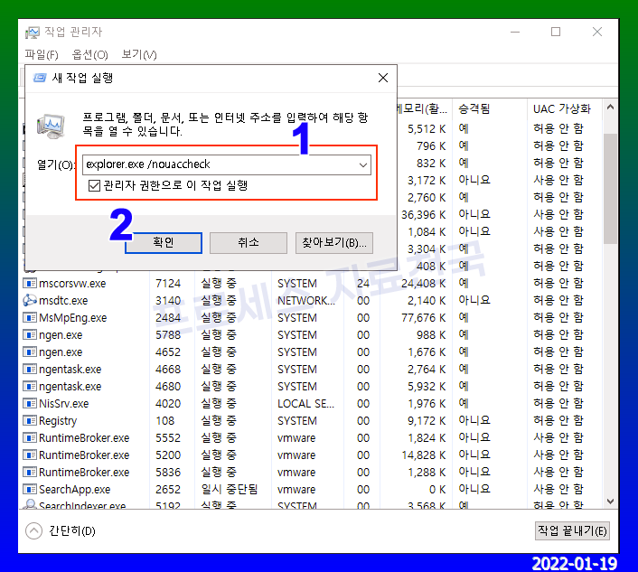 explorer.exe /nouaccheck 를 복사하고 붙여넣기 하세요.