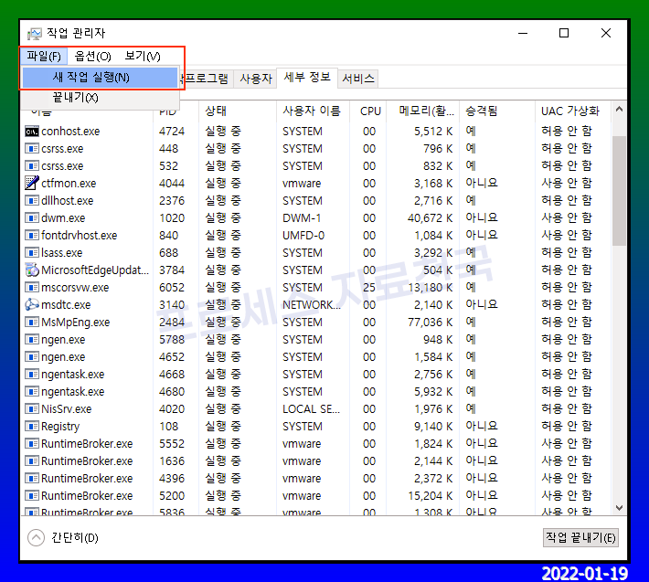 작업관리자 파이 메뉴에서 새 작업 실행을 클릭하세요.