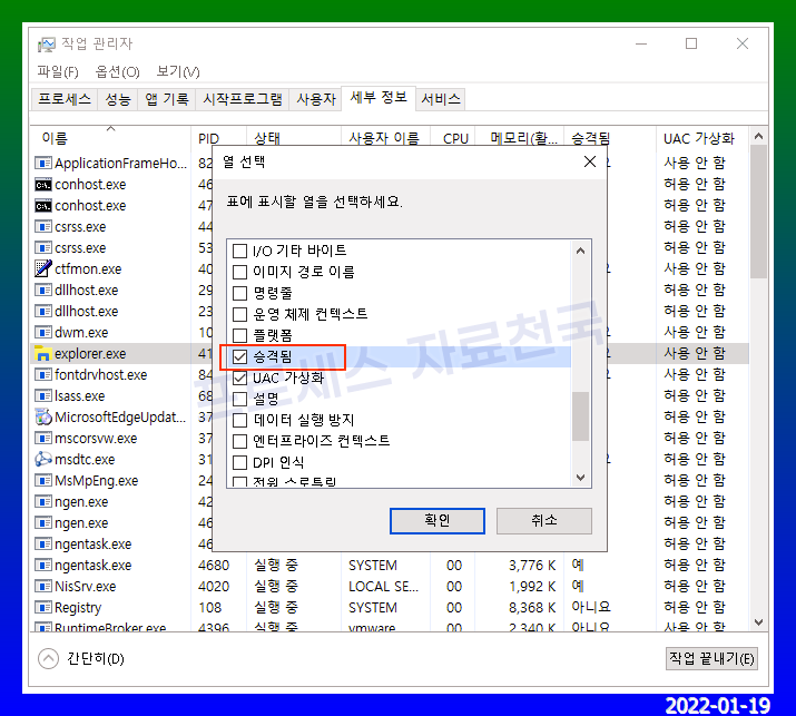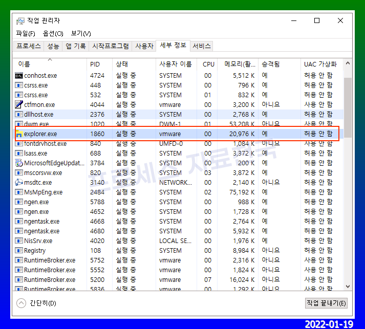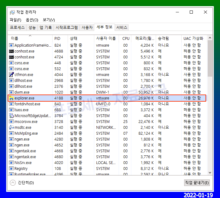 작업관리자의 탐색기의 권한 스크린샷입니다. 승격됨 열을 보면 [아니요] 로 표시되어 있네요.