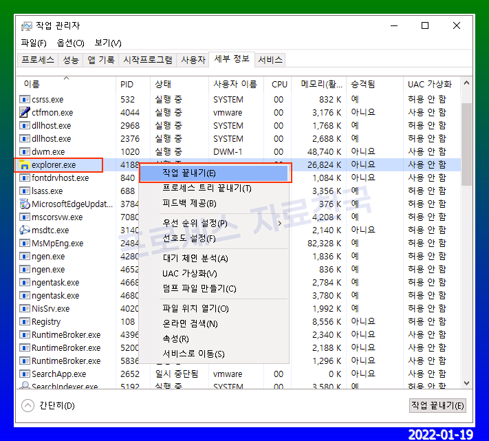 탐색기 프로세스(explorer.exe)를 마우스 우클릭해서 작업 끝내기를 클릭하세요.