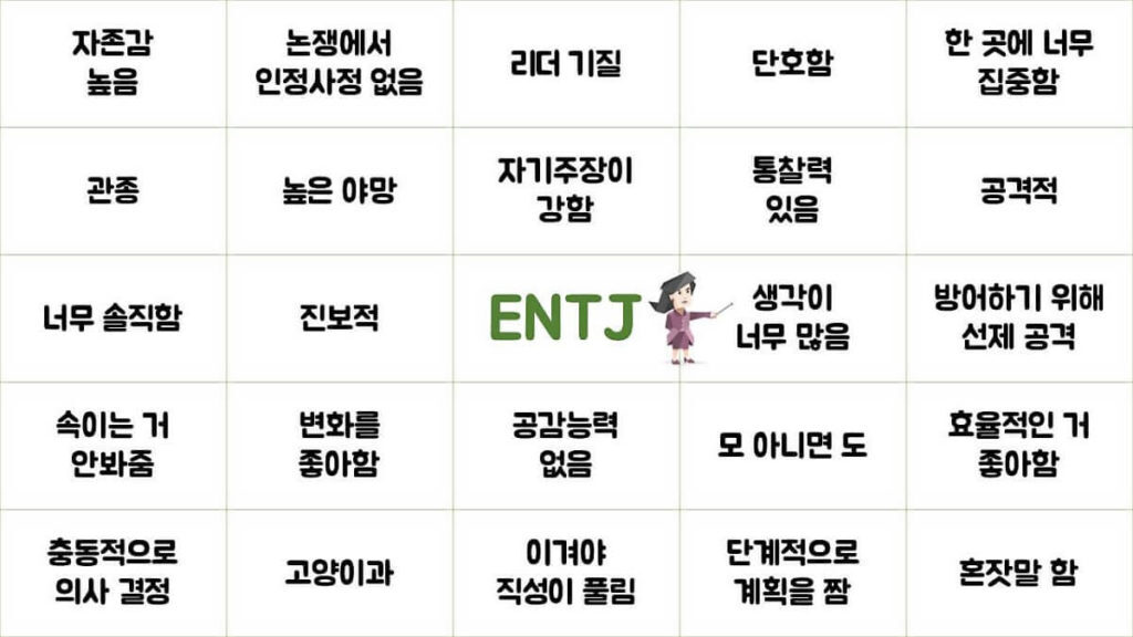 ENTJ 특징은 16가지 성격유형중에서 가장 궁합이 좋은 편에 속합니다. 하지만 사람마다 느끼는 것이 다르기 때문에, MBTI 유형 궁합은 참고로 해주시면 좋습니다.