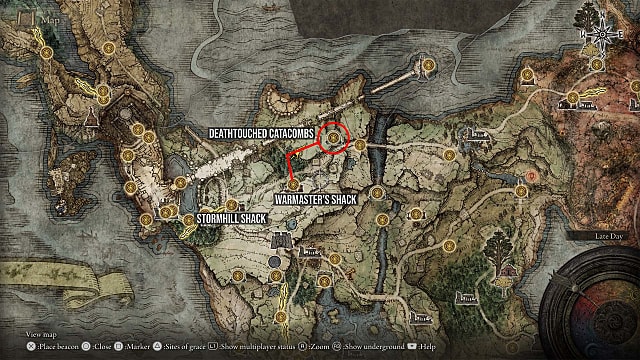 Deathtouched Catacombs에서 Elden Ring Uchigatana 를 얻으려면 먼저 Warmaster's Shack으로 이동하십시오. Warmaster's Shack이 어디에 있는지 모른다면 Stormhill Shack Site of Grace의 동쪽에 Stormveil Castle으로 가는 길에 있습니다. Warmaster's Shack에서 Shack 북쪽의 숲으로 가십시오. 오른쪽에 우뚝 솟은 바위를 찾아 동쪽으로 가십시오. 이 지역을 가로지르는 높은 돌다리 그늘이 있는 고원까지 동쪽으로 가십시오.