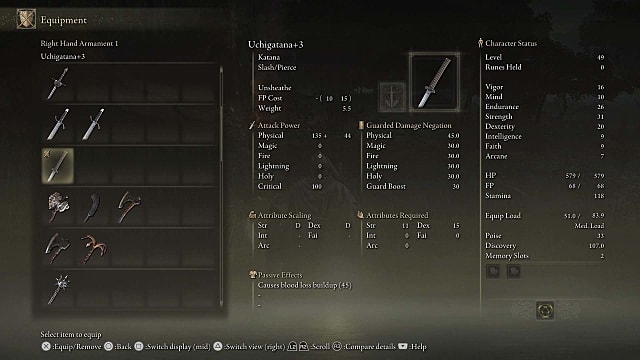 게임에서 최고의 무기는 아니지만 Uchigatana 는 빌드와 스타일에 따라 게임 중반에서 후반까지 업그레이드할 수 있는 꽤 괜찮은 게임 초반 무기입니다. Uchigatana는 초기에 Strength와 Dex 모두에 동등하게 조정되지만(둘 다 기본적으로 D 등급 조정 속성임) Blacksmith Hewg 에서 +4로 업그레이드한 후 민첩성에 기울어집니다 .