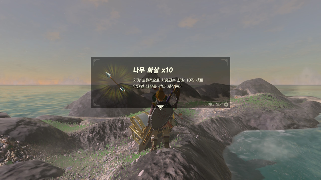 4. 이 보물 상자를 마그넷 캐치로 건져 올려 열어보면 나무 화살 x10 개를 획득할 수 있습니다.