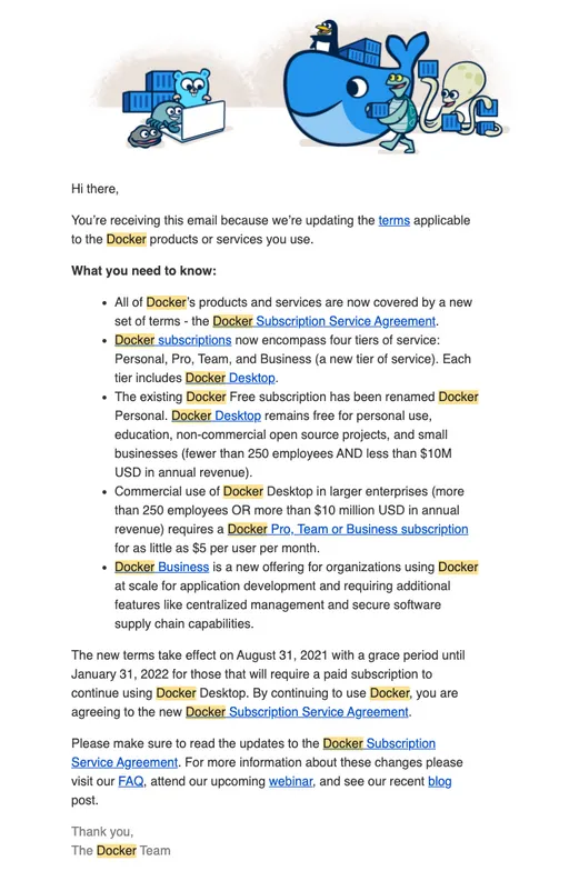 동시에 IT News 사이트들도 기사를 내기 시작했던 것 같습니다. 아래 링크는 그러한 기사 중에 하나입니다. "도커 데스크톱, 대기업 사용자에게는 유료화된다"