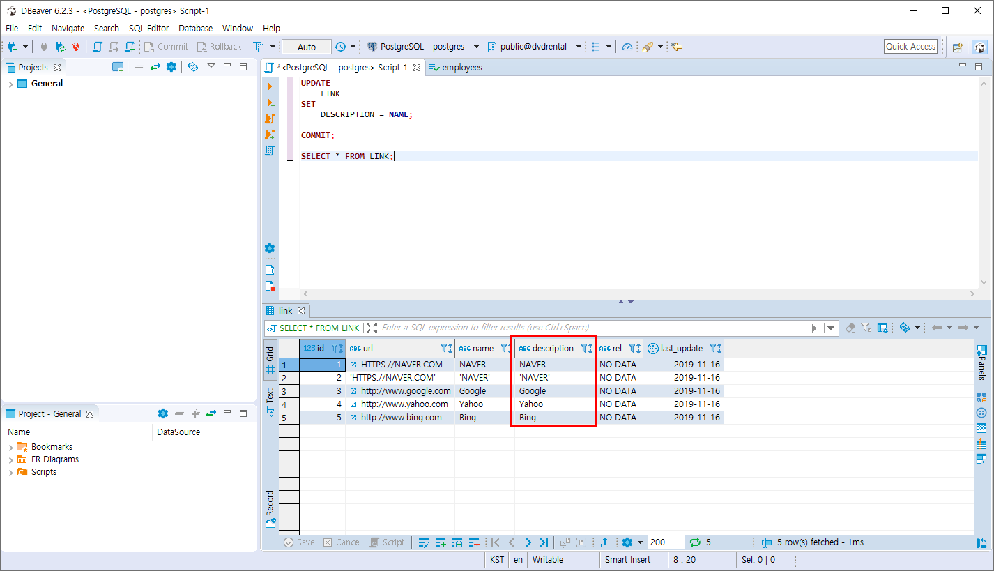 - LINK 테이블의 DESCRIPTION 값을 NAME컬럼으로 수정합니다.