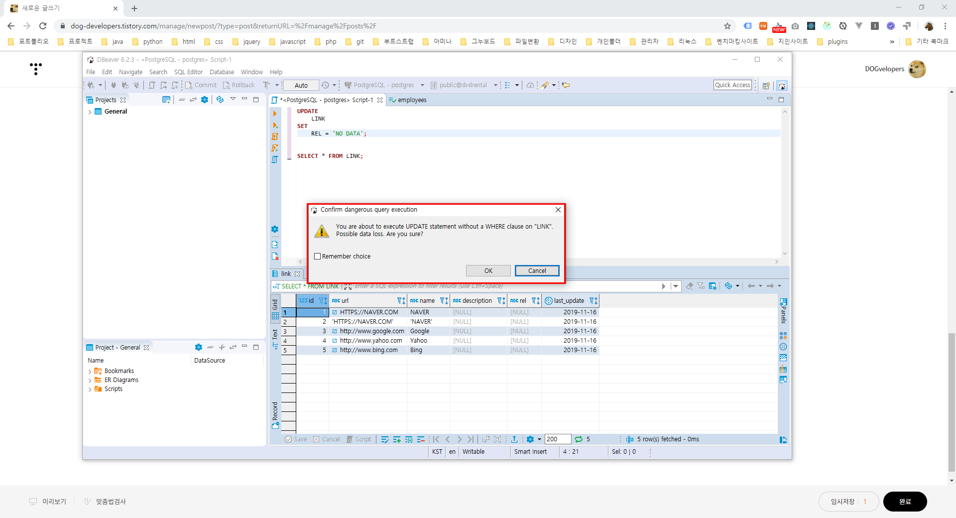 - DBeaver에서 모든 데이터를 조건없이 수정을 할 때 모든 데이터를 수정할 것인지 경고 문구가 뜹니다.