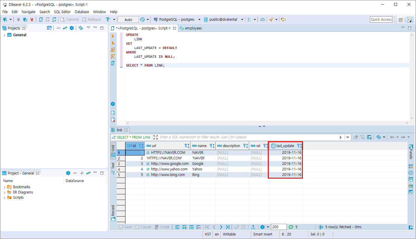 - LINK 테이블에 추가된 LAST_UPDATE 컬럼의 값이 NULL인 값만 DEFAULT 값으로 수정