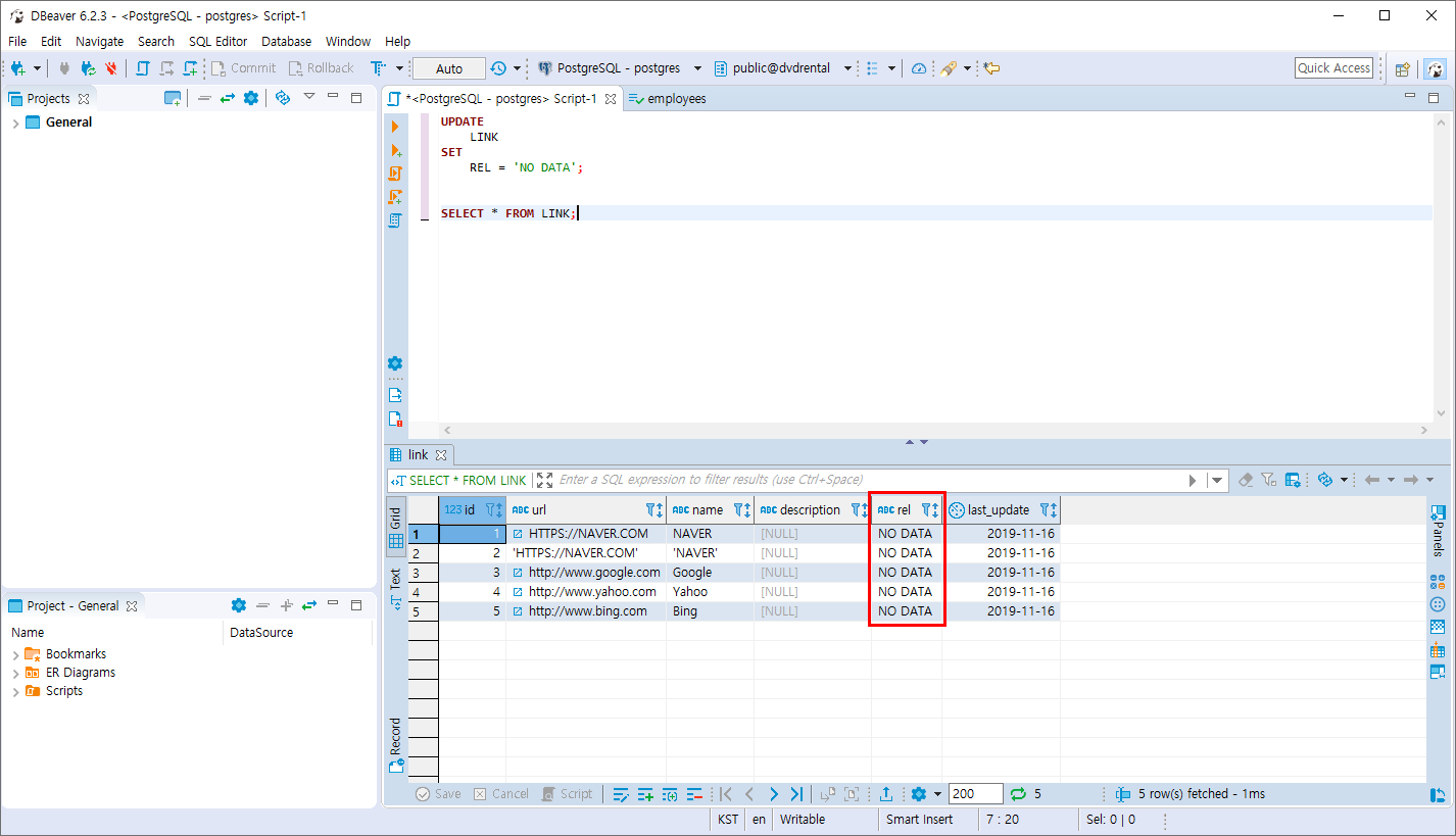 - LINK 테이블의 REL 컬럼의 모든 값을 'NO DATA'로 수정