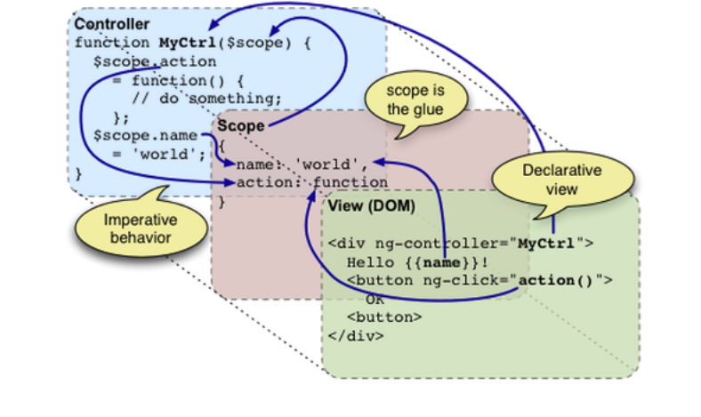 - View는 템플릿으로 Scope의 투영체이고, Scope는 Model과 View의 연결하며 controller로 이벤트를 보내는 역할을 한다.