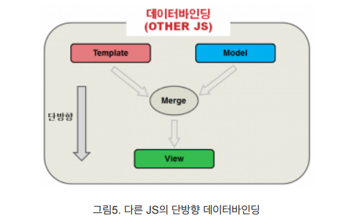 그림5 분석 : 다른 JS들은 그림을 보다시피 최소 한번 템플릿과 모델이 결합되야하며 이 또한 자동적으로 이루어지지 않는다. 이말인즉슨 개발자가 일일이 모델과 뷰를 지속적으로 싱크를 맞추도록 코딩을 해야한다는 것으로 코딩이 불가피하다. 이로써 UI와 자바스크립트 속성에 데이터를 할당하기 위해 추가적으 로 해야할 작업이 상당히 많아진다.