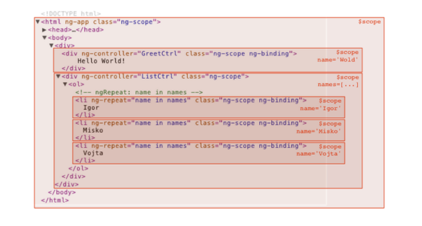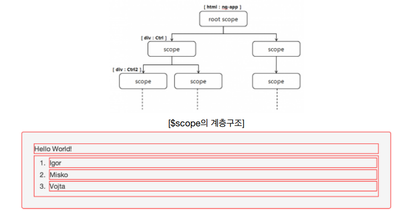 - Scope는 DOM 구조와 가깝게 하이어라키 구조를 갖는다(하이어라키 구조는 아래의 그림을 참고^^;)
