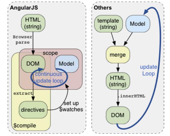 - Angular는 템플릿이 HTML이어서 바로 DOM으로 해석되고 DOM안에 directive가 템플릿 엔진인 $compile지시어를 통해 $watch를 설정하고 모 델의 변경을 계속 감시하게 된다.