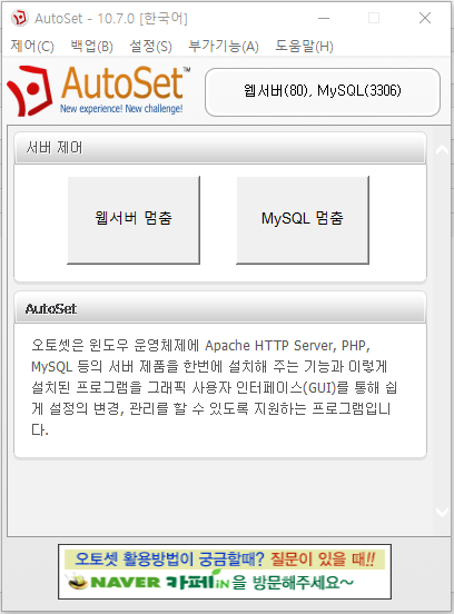 AutoSet 유지보수 종료 안내 1. 오토셋에 대한 유지보수 계획이 없기에 사용자분들께 이 내용을 알려드립니다. 2. 현재 사이트를 통해 제공되는 버전이 최종 버전이며, 더 이상의 업그레이드가 없