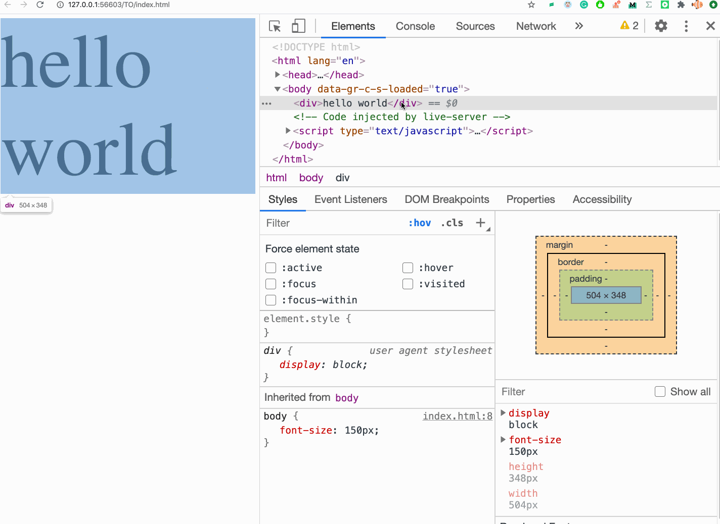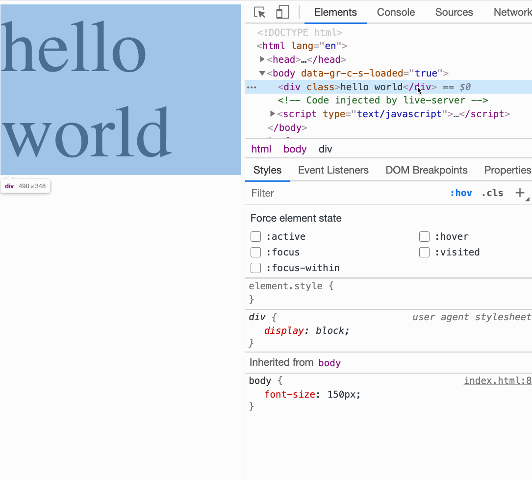 <!DOCTYPE html> <html lang="en"> <head> <meta charset="UTF-8" /> <meta name="viewport" content="width=device-width, initial-scale=1.0" /> <title>Document</title> <style> body { font-size: 150px; } div:hover { color: red; } div:active { color: blue; } div:focus { color: brown; } </style> </head> <body> <div>hello world</div> </body> </html>