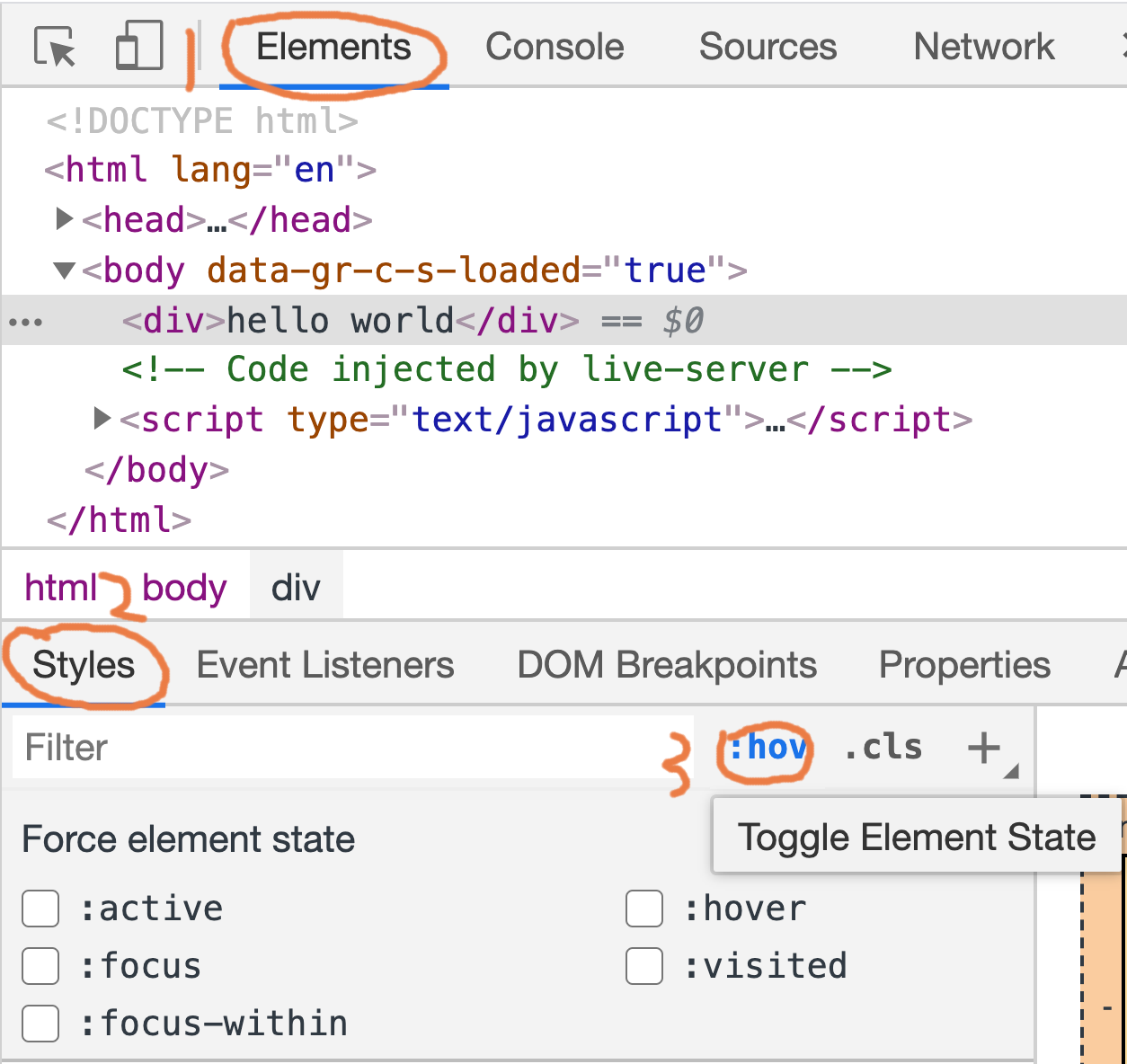 위 html을 브라우저에서 연 뒤, Elements 패널에서 가상 클래스를 디버깅해보자.