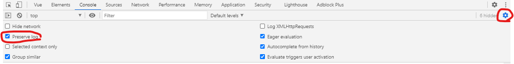step.2 console탭의 톱니바퀴를 누른후 Preserve log체그박스를 체크한다.